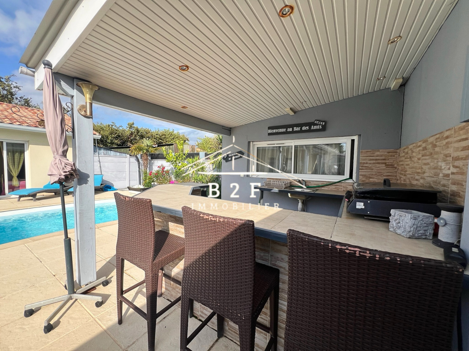 - Terrasse couverte de 21,49 m² équipée d’un store, parfaite pour des soirées conviviales