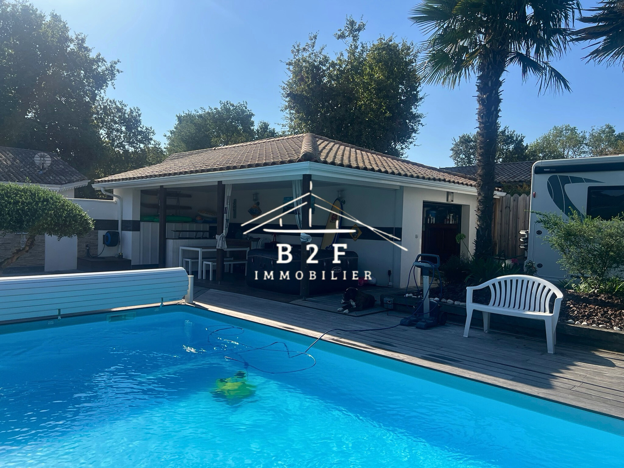 À l’extérieur : pool house avec cuisine d’été, grand garage, stationnements pour 3 véhicules / bateau / camping-car, jardin avec arrosage automatique par puits foré.
